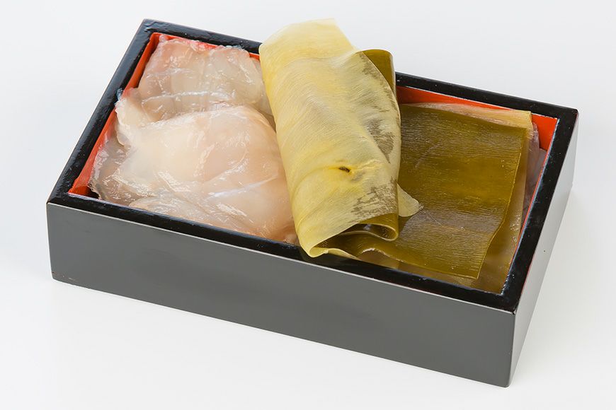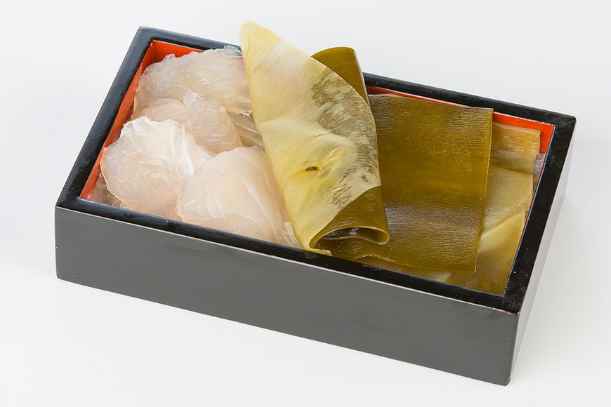平目・甘鯛など特に選りすぐった最高級品の素材と北海道羅臼産の昆布を使い、昆布〆にしました。